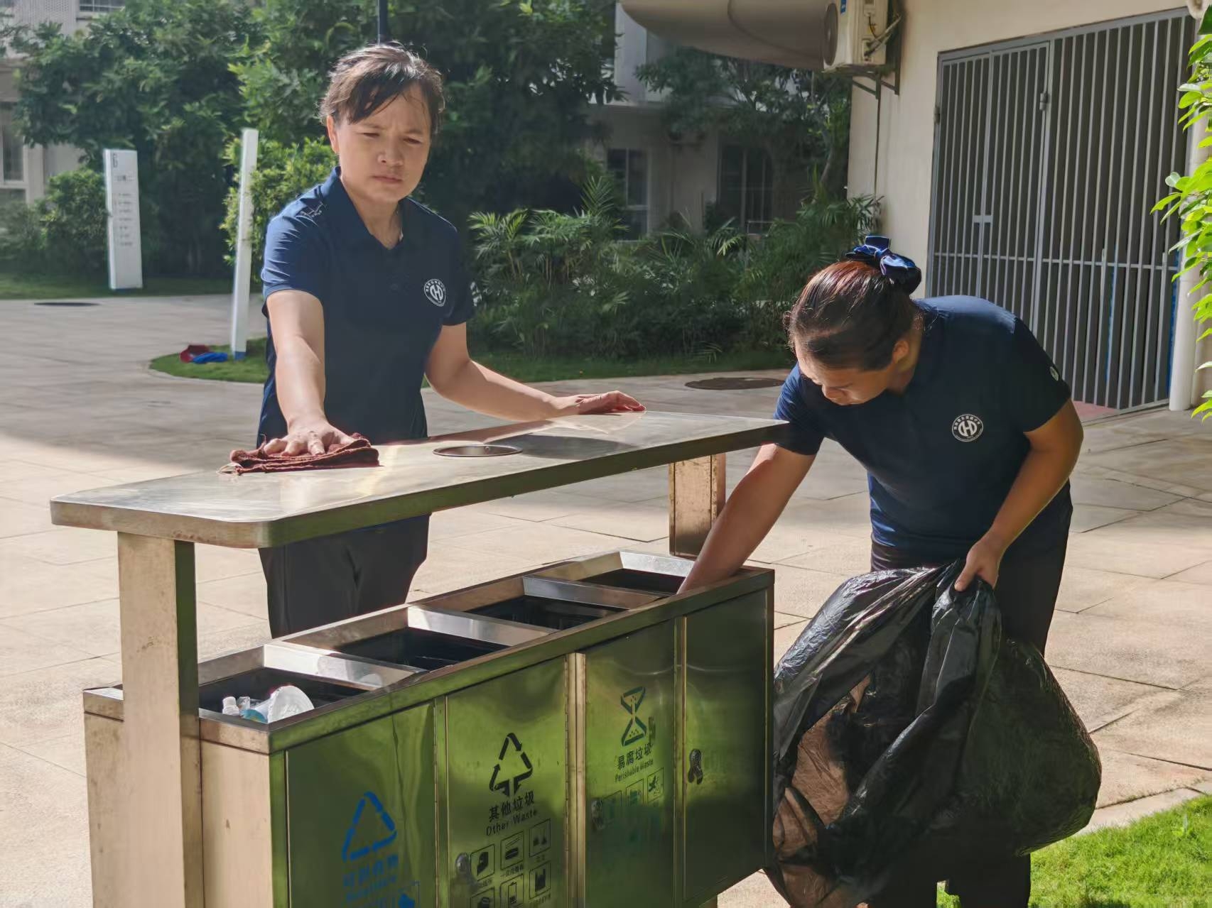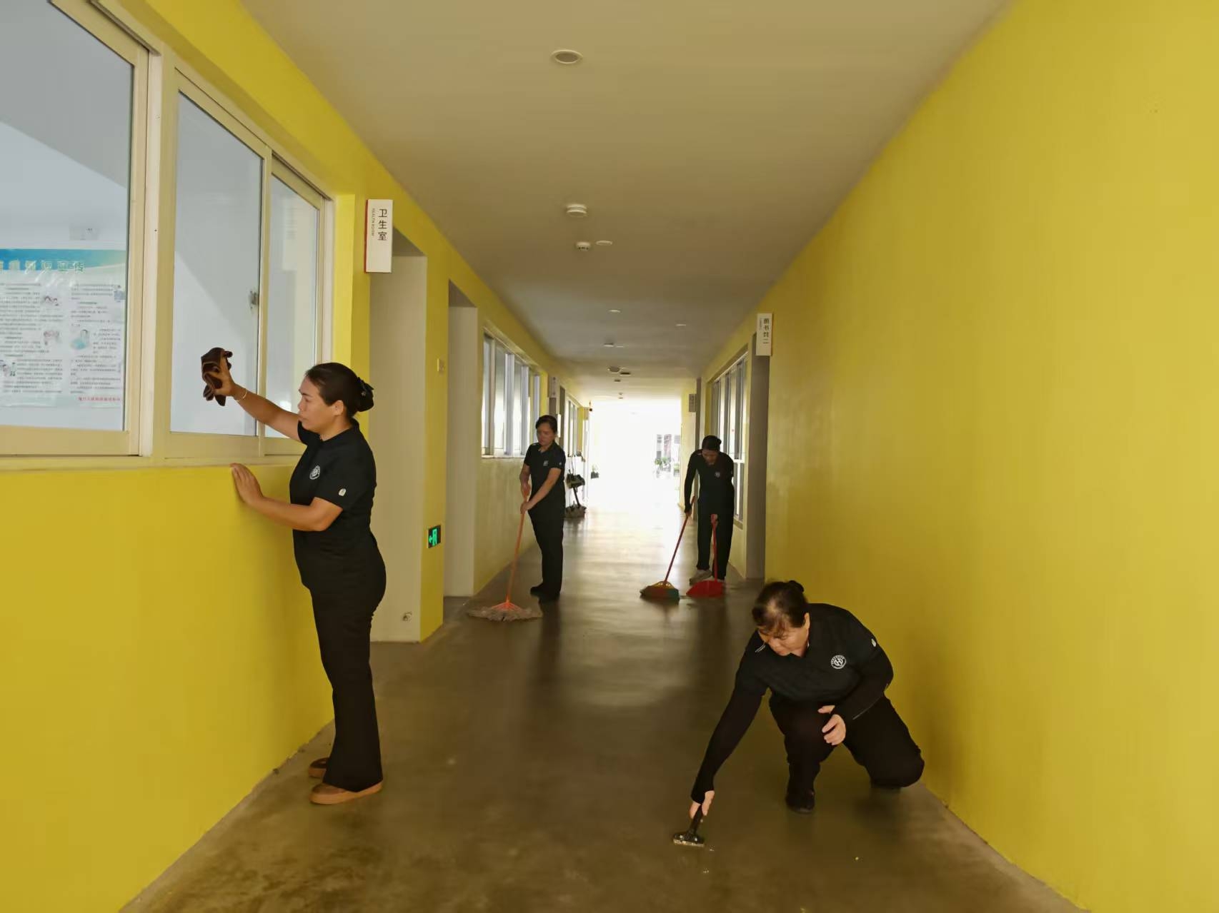 以扫帚为笔、以抹布为刷,寰高保洁人员用“时时净、处处美”勾勒校园的整洁画卷。天未亮,他们就已穿梭在教学楼、操场、走廊,清扫落叶、擦拭栏杆、消毒公厕,让校园在晨光中焕发清爽;课间课后,他们随时补位,清理各楼层的尘土、擦拭楼梯间的污渍,连垃圾桶周边都保持无异味、无残留。遇有学生不小心打翻水杯、洒落饭菜,他们总能及时上前清理,还会笑着说“没关系,下次小心点”。用日复一日的坚守,将“星级洁净”铺满校园每个角落,用干净舒心的环境,给师生最温暖的“视觉关怀”。