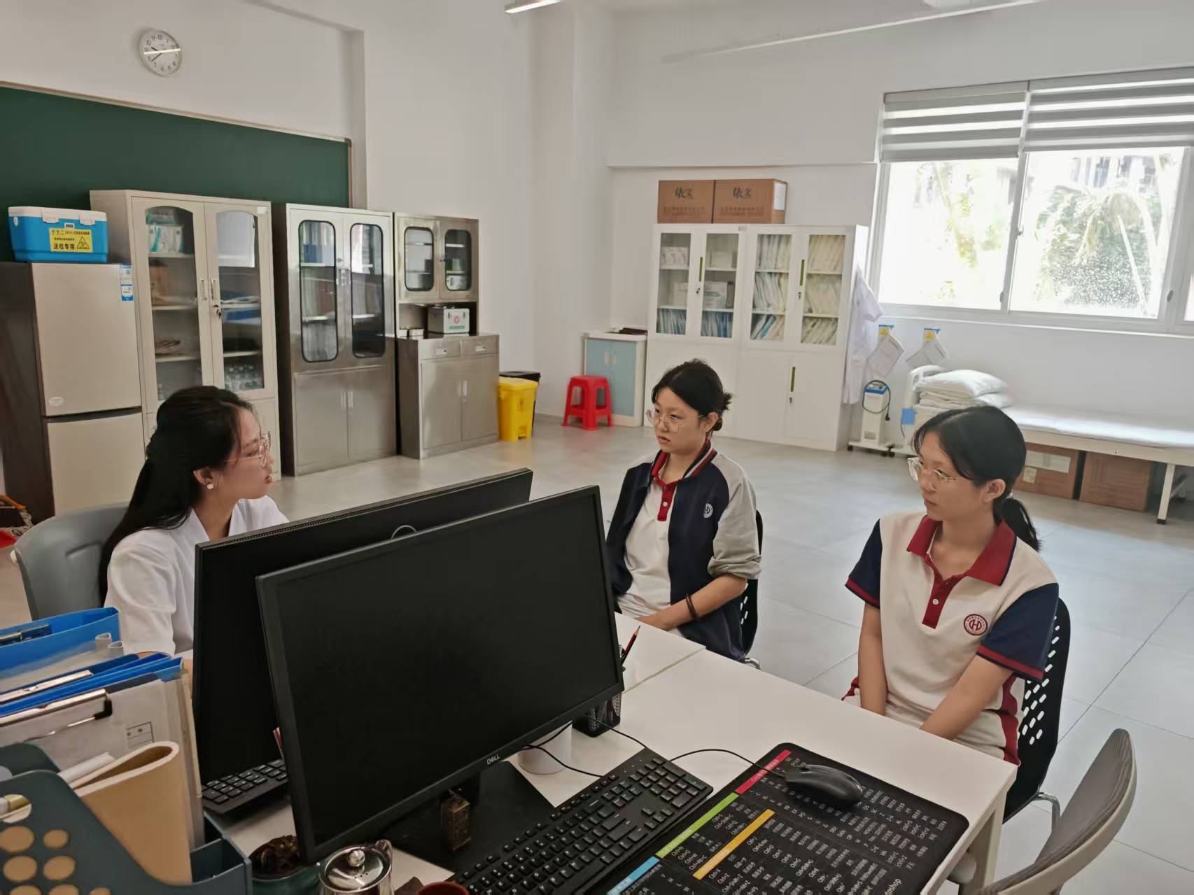以医务室为“健康驿站”,寰高校医以“专业诊疗+暖心关怀”筑牢师生健康防线。学生头疼发烧、擦伤碰伤,他们总能第一时间精准处置,一边轻柔处理伤口,一边用温和的话语缓解紧张;季节交替时,他们提前开展健康讲座,普及流感预防、用眼卫生知识;运动会上,他们背着药箱守在赛场边,随时准备应对突发状况。对身体不适的学生,他们不仅细心诊疗,还会跟踪康复情况,主动联系家长沟通;对有心理压力的师生,他们耐心倾听、温柔疏导。用专业的医疗技能和亲人般的关怀,打造“星级健康守护屏障”,让师生在校园里安心学习、放心生活。